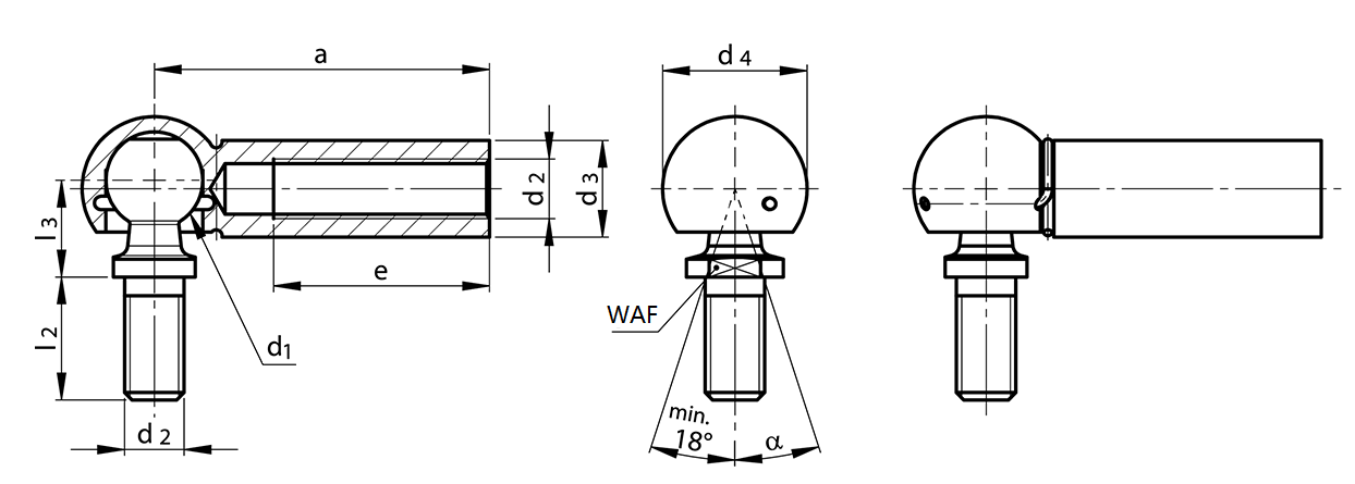 Artikel | d1 h9 | d2 | a ±0,3 | d3 ±0.5 | d4 ±0,5 | e Mindest | l2 ±0,3 | l3 ±0,3 | WAF | a | Gewicht (kg/1000 Stück) |